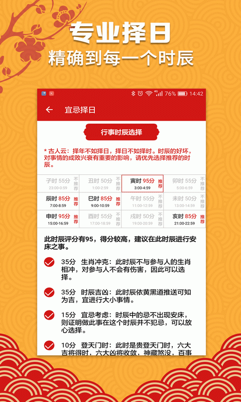 ★八字择日:吉历万年历依据周易命理和民俗习惯,依据参与人的生辰八字,严谨地选择出合适参与人八字的黄道吉日,并且进行评分解析,让参与人知道什么时辰(几点)做事更吉利。