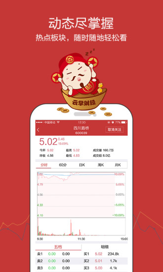 云掌财经是一个大众化与专业化并存的综合性互联网财经平台。云掌财经以财经资讯金融产品为核心,通过网站平台、财经媒体、专业频道等渠道,拥有中国领先的投资分析师专家团队和经验丰富的技术创新研发团队。云掌财经隶属于安徽黄埔网络科技有限公司,秉承服务至上,专业为先的理念,为投资用户带来专业的财经资讯、及时的财经直播,独到的股市解读,全面覆盖财经领域,为用户提供有价值的财经资讯,满足投资者的投资需求。【软件特点】