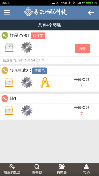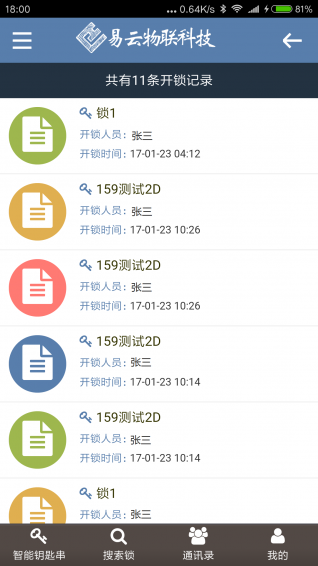 易云物联app是一款关于各种通行的产品,利用了蓝牙4.0、二维码等技术,目前产品有开发智能家居锁类,智能通行开关。能够管理您各个场所的所有智能门的钥匙,方便随时开门。在不久的将来我们会不断的推出新轻行、通行产品。【更新日志】