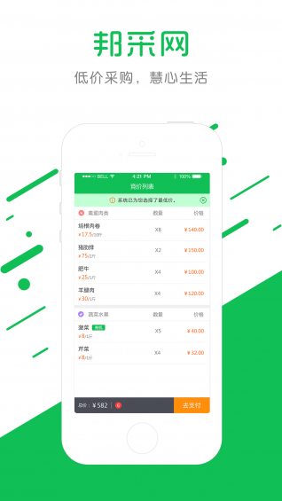邦采是一款手机网络购物平台。软件帮助企业和单位食堂采购各类原材料、配料并送货上门,大大解决了企业和单位在采购食材方面的烦恼,省时省力,方便快捷。