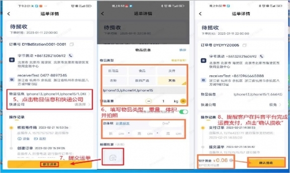 3. 点击“物品信息 - 快递公司”,接着填写相关信息并拍照,之后提醒客户进行支付。