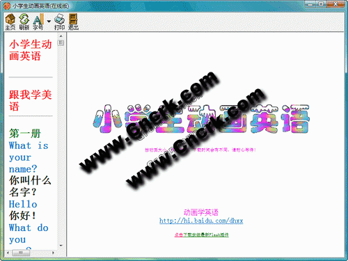 适合小学生学习英语,flash动画形式,生动有趣,内容丰富可以在线学习小学新标准英语;跟我学美语;英语口语;伊索寓言学英语;新概念英语和动听的英语歌曲。