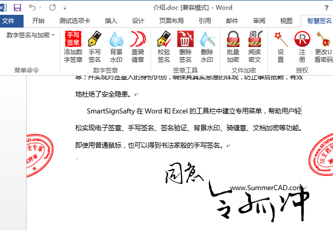 SmartSignSafety在Word和Excel的工具栏中建立专用菜单,帮助用户轻松实现电子签章、手写签名、签名验证、文档加密、文档保护、背景水印、Excel 数据防拷贝等功能。即使用普通鼠标,也可以得到书法家般的手写签名。