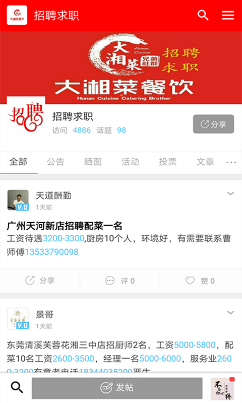 大湘菜社群是一群由湘菜厨师组成的群体,目的整合湘菜资源,实现资源对接,发扬湘菜文化,传播湘菜人精神,大湘菜社群APP是为厨师打造的一个交流平台,免费发布招聘求职,菜品交流等等,属于大湘菜餐饮,也属于所有餐饮人,大家可以自由发布动态,可以晒图,分享小视频,分享好的菜品和食材,请大家共同维护大湘菜的发展,让顾客能更方便找到我们,提高页面质量,方便使用下载,欢迎亲们下载使用,为了更好推向市场,希望各位亲多多转发,让更多的人找到大湘美食,有哪里不完善的,可以提出您宝贵的意见和建议,多多品尝,多多分享。