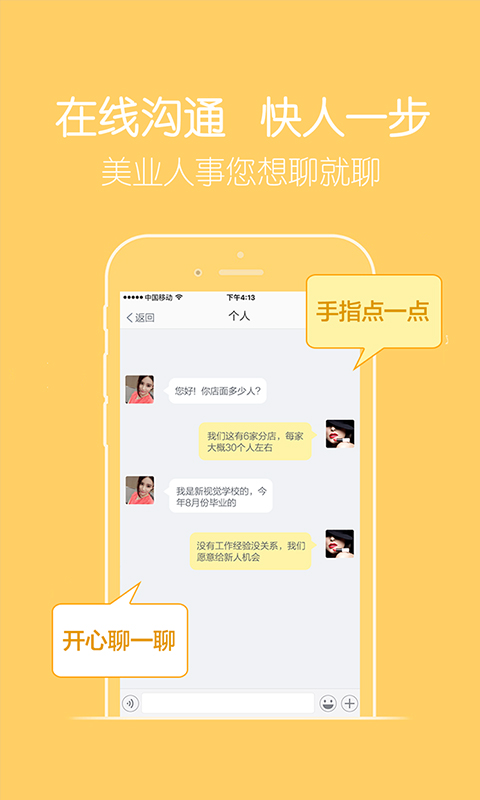 【实时互动】聊天功能,让您在畅聊的过程中,轻松找到自己想要的工作/人才,极大压缩时间成本的同时迅速扩展人脉资源。