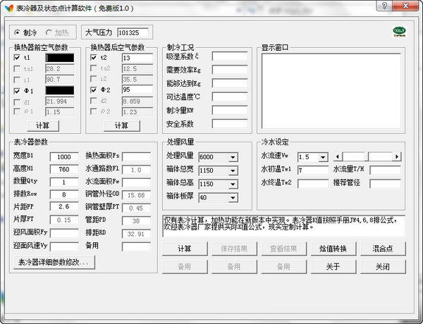 表冷器及状态点计算软件下载 V1.0 免费版 表冷器及状态点计算软件是一款专门针对表冷器所制作的计算工具。该工具拥有露点温度、空气密度、蒸汽分压、空气阻力以及水阻力的计算功能,可以帮助用户快速计算,无需动脑。
