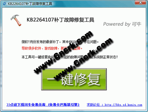 可牛补丁故障修复工具 V1.0 简体中文绿色免费版 7月14日上午,有用户在可牛免费杀毒官方论坛反应,某安全厂商昨日推出的微软补丁KB2264107存在问题,可导致多款软件、游戏故障无法启动,甚至有的网友系统蓝屏。可牛免费杀毒应急小组紧急推出“KB2264107补丁故障”修复工具,可完美解决补丁KB2264107导致的软件故障。