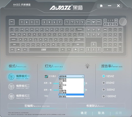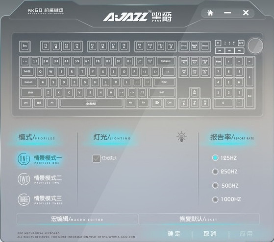 在驱动程序的默认界面,玩家可以调节键盘的报告率,切换情景模式,也就是键盘不同的配置,另外还可对灯光及宏按键进行编辑。