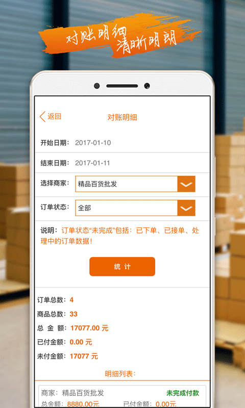 手机批货通APP以便捷的功能与服务,获得市场、使用客户的认可。APP主要提供给采购商进行下单,对帐使用以及批发商进行订单处理查询统计使用。
