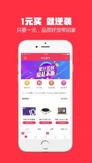 幸运壹号app是一款网络购物类应用,本款软件为用户提供有趣、刺激的一元购物功能,只需要一元就能买到你梦寐以求的东西,还在等什么呢心动不如行动。