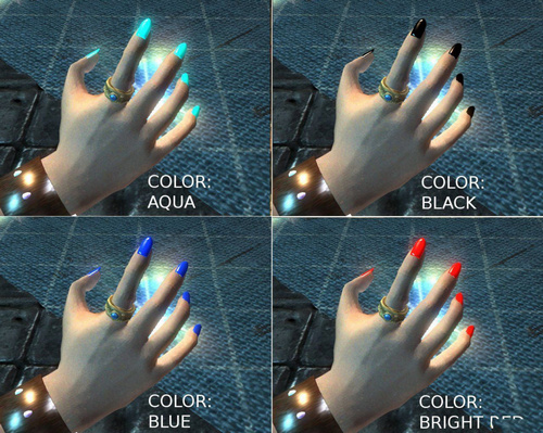 上古卷轴5:天际重制版 卡奥的美甲MOD;有10种颜色的轻甲,重甲和无甲法师美甲。所有美甲均可精工制作和增强。装备了美甲可以同时装备戒指但是不能装备手套,仅限女性。三种类型美甲,均有护甲值,均会受到其相应技能增益。【使用方法】