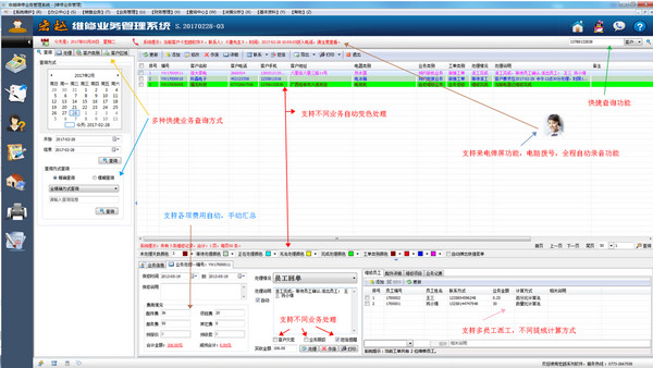 系统不但可在线实时发送短信到客户手机,还可以短信,也可利用短信实时对员工进行派工或发送维修通知到客户手机上。在我们的系统上每个窗口都提供了短信发送功能和电话拨打功能。