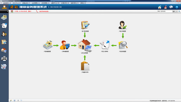 系统从前台接机到员工维修、客户取机、电器返修、维修跟踪等全程实现了维修服务企业日常营运的全面电脑自动管理,强大的来电号码追踪功能,不单为你的电脑增加了来电提示功能,还可通过来电号码自动识别来电客户信息,也可使用我们为您提供的短信平台向客户发送相关维修信息。系统不单是一套维修管理软件,也是一套供销存管理软件,在当今家电行业的不断发展情况下,维修行业不单只是维修电器,同时也会销售配件等其它同类产品,在此情况下,我们为你提供了维修取件,产品短缺自动提示,产品报价、产品销售、客户退货、库存情况等供销存功能。