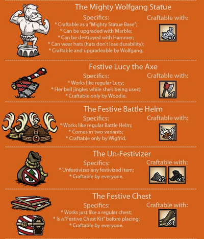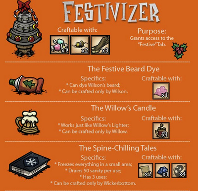 所以,我们在这里。我工作相当努力,在过去几个月给你这个mod,希望你喜欢它。所有用Festivizer制作的物品在制作时不会重新获得任何使用/燃料%(aka你制作20%的帽子,你获得20%的皮肤帽子),所以它非常平衡。