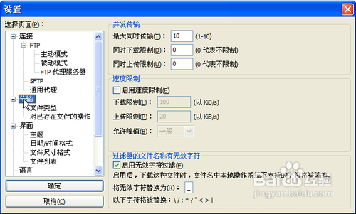 3、下载加速秘籍:使用Filezilla软件下载FTP文件,默认只开启了两个线程,在传输的队列中也可以看到,只有两个文件在同时下载。我们可以设置使用10个线程同时下载,设置方法如下:菜单编辑==》设置,弹出如下画面,点击左边"传输",设置“最大同时传输”为10,点击“确定”保存设置。下载速度马上就飚升起来了。