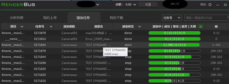 如果您是渲染单帧效果图,同时运行着几个任务,当您的余额不足的时候,系统只会暂停那些已经渲染出来、但是未能成功扣费的任务。而其他的正在渲染的任务,是不会暂停的。所以,就算余额不足,您也无需担心所有的任务都会被暂停(有些任务也许已经渲染几个小时了,一暂停又要重来就惨了...)。