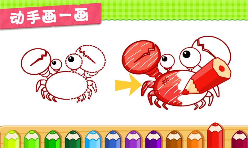 画一画:小蝌蚪长什么样?青蛙妈妈长什么样?还有金鱼、螃蟹、乌龟、熊猫,你还记得他们的样子吗?没关系,“画一画”中教你用简单的线条画出他们,还可以把他们放到池塘里哦