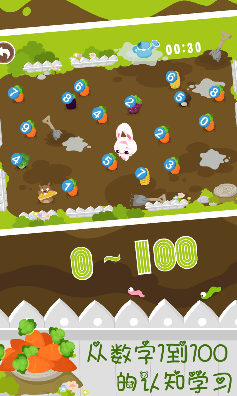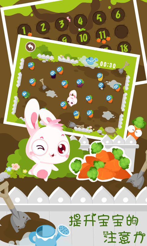 儿童学习-认数字适合各个年龄段宝宝玩,可爱有趣的动画和声音效果,简单好玩的点划操控,难度逐级增加,在宝宝遇到困难时给予提示,让宝宝们突破重重障碍完美通关,寓教于乐,通过小白兔拔萝卜学数字认数字的方式,培养宝宝们的学习乐趣!