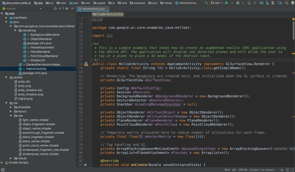 若要在 Android 上开启使用 ARCore,您可运行 ARCore SDK 所附带的 hello_ar_kotlin 或 hello_ar_java 示例应用程序。这些示例应用运用 OpenGL,这是一个用于渲染 2D 与 3D 矢量图形的编程接口。这些应用程序会展示检测到的所有平面,还允许用户点击平面以放置 3D 模型。