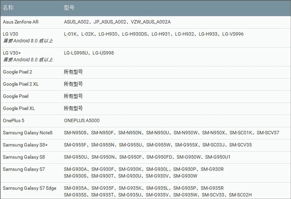 ARCore支持的机型,可在运行Android 7.0(Nougat)及更高版本系统的多款符合条件的安卓手机上使用。 在开发者预览版阶段,ARCore支持以下设备(如下图所示)。
