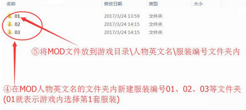 4.在MOD人物英文名的文件夹内新建服装编号01、02、03等文件夹(01就表示游戏内选择第1套服装)