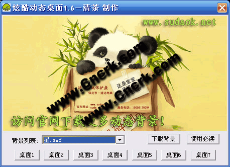 软件界面上有五个桌面按钮,可以快速设置喜欢的动态桌面背景。您还可以去网上任意下载自己喜欢的flash动画设为动态背景,快去试试看吧!