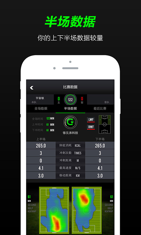 通过解析从T-Goal智能足球手环上传输过来的数据,T-Goal应用程序将绘制你在球赛中的个人活动区域热点图、冲刺时长时速、体能消耗等,记录你在赛场上的每一分努力。
