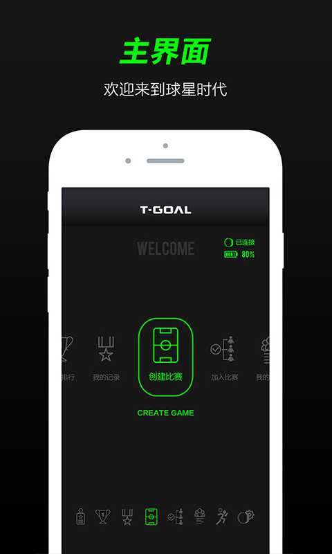 T-Goal应用程序与T-Goal智能足球手环搭配使用,可追踪足球场上的跑动距离、速度、绘制全场比赛的跑动热点图,同时将您创造的个人记录与球历结合,累计形成您自己的足球生涯,拥有个人球星卡。它能记录您所有的足球比赛,留住球赛精彩瞬间。用专业数据,读懂自己的每场比赛