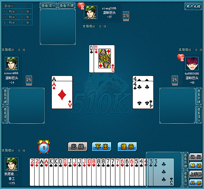 平潭510k是由四人,两副共108张扑克牌组成,游戏的牌型比较自由,再加之独特的得分规则,使得游戏过程中牌局变化很多,既有趣又刺激。在510k中,5,10,k这三张可组合成炸弹,但是最小的炸弹。510k是一个既考验牌技又考验团队意识的益智游戏。
