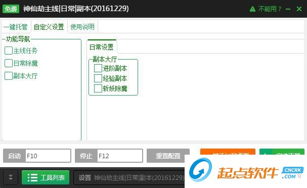 1.打开新浪神仙劫日常除魔任务辅助工具2.选择—自定义设置—日常设置—勾选你所需要刷的任务以及副本然后按下F10来开启外挂
