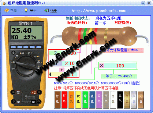 软件采用真实的万用表和电阻作为界面,操作简单,形象的显示出计算色环电阻的整个过程,使用者很快就能掌握如何计算色环电阻阻值,能够计算出四环、五环。并且能计算出仪表中高精度电阻的数值