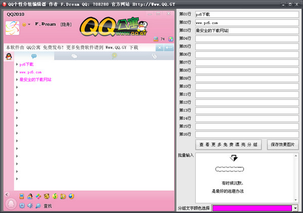 qq个性分组编辑器快速编辑出QQ个性分组,瞬间产生QQ个性分组效果图,支持批量导入现有QQ分组文本,支持更改QQ个性分组颜色。虽然不可以直接在自已qq面板上操作,但是可以直接预览到效果,免去在实地qq重复操作的麻烦。