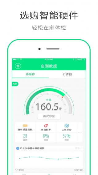 1、选购智能硬件,轻松在家体检。华领健康APP配合智能体脂秤使用,即可同步体重、脂肪率、内脏脂肪指数等8项重要体征指标,评测分析身体状态。帮助您明确方向,使您在家也可以轻松体检。每天更接近理想的自己。