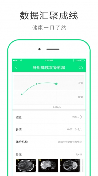 您的历年体检数据都可以在App中查询。体检数据汇聚成曲线,让您可以更加清楚了解自己的身体健康变化,并进行有针对性的改进。
