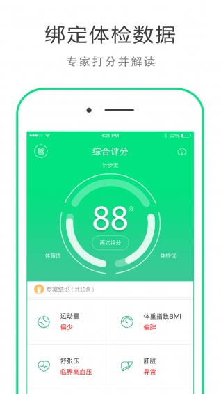 体检后登录App,就可以及时获取您的体检结果。我们的医疗专家会根据您体检数据,为您的健康进行打分,并对不合格的体检项目进行有针对性的解读。让您对自己的健康状况更形象的了解。