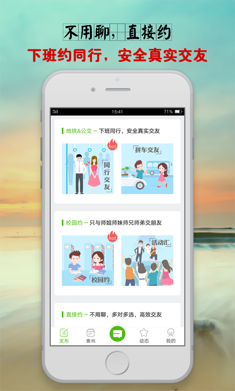 跨越一对一低效的聊天,直接发布约会,报名约会,双向多对多选择,简单高效;