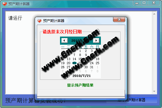 预产期计算器 V1.0 简体中文绿色免费版 预产期计算方式有很多种。其中最常见且最简单的一种就是根据最后一次月经的时间来计算。我们平时所说的十月怀胎,大致时间为 280 天。本软件能根据用户提供的最后一次月经时间,推算大致的预产时间。让你心里有底,做好准备。当然,实际分娩时间与计算结果可能会有 1~2 周偏差,这属于正常情况。荐听医嘱。