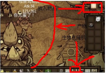 用夜魔盔甲种克隆机,装备克隆机后主角隐身(以免遭怪物围攻),屏幕右侧会出现格子和按钮,在格子中放入1个生物掉落的物品,按GO按钮,就可以克隆20个该生物,具体为:蜘蛛丝克隆蜘蛛女王、犬牙克隆火狗、牛毛克隆牛、触手皮克隆触手、蛙腿克隆青蛙、蜂刺克隆杀人蜂、蚊子血囊克隆蚊子、高鸟蛋克隆大高鸟、海象牙克隆海象、活木头克隆树精、鸡蛋克隆火鸡、夏象鼻克隆夏象、冬象鼻克隆冬象、巨鹿眼球克隆巨鹿、鱼克隆鱼人、食人花肉克隆食人花、岩石克隆龙虾、香蕉克隆猴子、缀食者皮克隆缀食者、远古守护者角克隆远古守护者、虫子果克隆虫子、蜗牛龟壳片克隆蜗牛龟、蜗牛龟粘液克隆黏糊虫、蝙蝠翅膀克隆蝙蝠、兔人尾巴克隆兔人、猪皮克隆猪人。卸载克隆机后主角现身。拥有克隆机,让你有无限的怪物可刷,也可用于以怪制怪,比如在牛群里制造触手,在蜘蛛群里释放杀人蜂等,创造一个生机勃勃的世界吧。【使用方法】