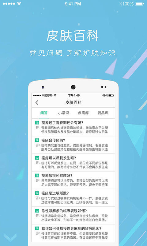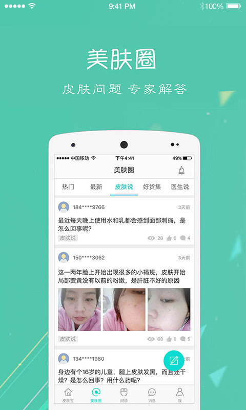 全国有将近2亿人,有着变美方面的需求。可能是受到皮肤疾病的困扰,可能是有着改善肤质的希望,可能是对适用哪些化妆品有着一些疑问。那么,下载皮肤宝,你都可以找到答案。变美从这里开始。同时,我们希望公立医院的医生、专家们的服务能够惠及更多的用户,每日开启限量免费咨询名额,如果您有这方面的需求,赶快下载皮肤宝把你的问题解决掉!