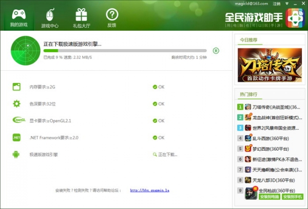 4.用户确定后,程序会重新检测系统,并自动下载、安装游戏引擎。