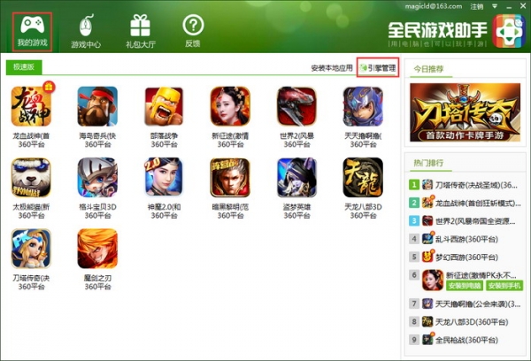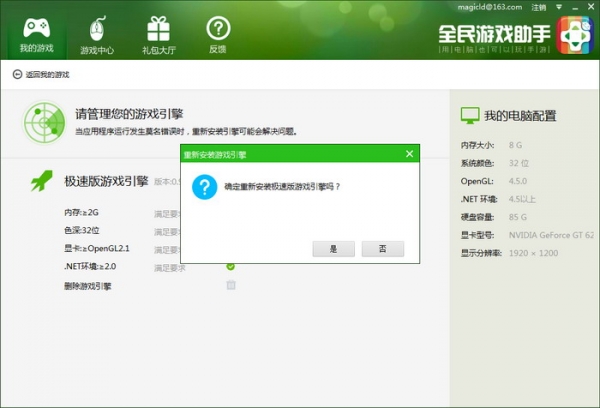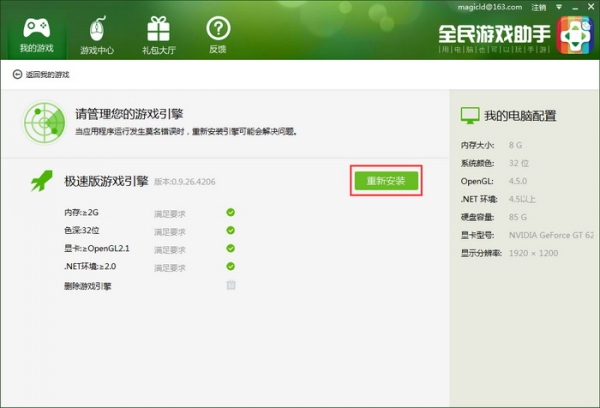 1.在《全民游戏助手》主界面中选择“我的游戏”标签,并点击“引擎管理”按钮。2.在“引擎管理”界面里点击“重新安装”按钮。