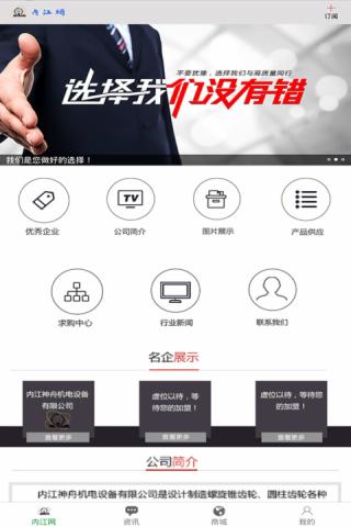 内江网APP是内江神舟机电设备有限公司专为机电行业门户设计的一款,集优秀企业商家入驻展示、公司简介、公司产品图册、机电设备供求、机电设备求购以及行业内资讯为一体的一款行业类APP。给广大同行业同胞提供了一个产品展示展销的场所,为你的产品销售保教护航!另外,本APP 还可以发布及时产品资讯,方便客户及时了解行业产品的规格标准信息等,以及价格问询采购与一体。