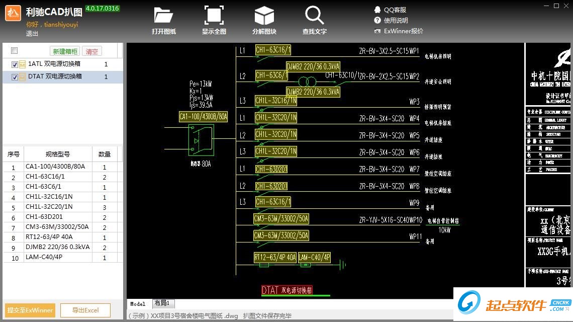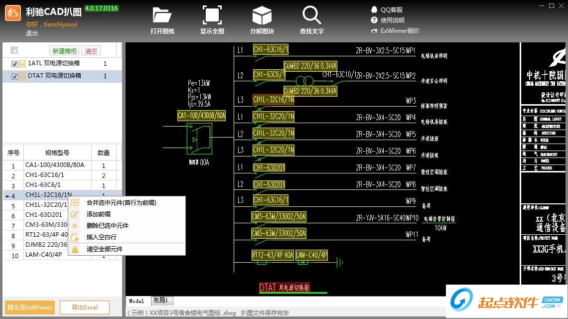一款快速打开CAD图纸,查看、拾取文字并输出excel材料单的工具软件。可实现快速查看CAD图、查找内容、拾取箱柜、元件内容,输出表格结果。快速帮助成套电气企业人员进行图纸预览、提取图纸中设备及元件信息,快速形成表价单、采购表单。极大的减少了图纸打印、录入、核对工作量。【更新日志】