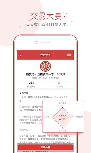 学交易的高效途径是模拟。App注册赠送百万模拟资金,为你消除资金压力和开户烦恼。更有多种交易比赛,赛制灵活,奖金优厚,以赛代练。
