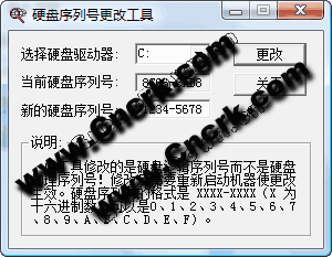 硬盘序列号修改查询工具 V0.1 简体中文绿色免费版 硬盘序列号修改器可以修改磁盘分区的序列号。硬盘序列号修改器修改的是硬盘逻辑序列号而不是硬盘物理序列号!修改后需要重新启动机器使更改生效。硬盘序列号的格式是 xxxx-xxxx(x 为十六进制数,可以是0、1、2、3、4、5、6、7、8、9、a、b、c、d、e、f)。