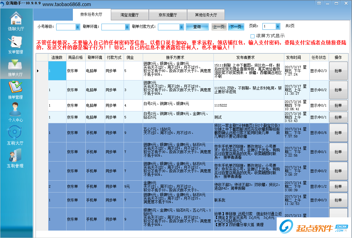 京淘助手后台修改无限接单软件一款采取8层加密、不留后门的淘宝后台修改管理软件,支持将已买宝贝的数据,评价管理的数据,跟支付宝明细的数据进行修改隐藏,根据自己的需求,一切数据自己说了算。软件隐藏,无声生息。在软件不关闭的情况下,任意刷新,任意远程,都只能看到你自己修改的数据【软件特点】