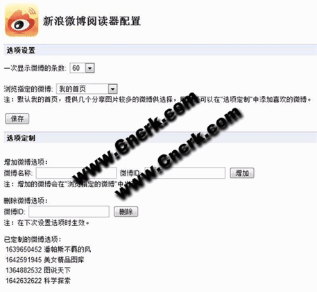 新浪微博阅读器定时检查是否有新的微博,可以不打开微博主页查看微博,所有图片均显示为原始图片,为保存原始图片提供了方便。支持转发微博。在popup页面点击“显示更多”可以在popup页面显示更多微博;点击“新标签页”可以在新的标签页中查看微博。在选项设置页面,可以设置一次获取的微博条数,或者设置获取指定的微博(本插件主要在查看图片方面有优势,因此提供一些分享图片较多的微博供选择,用户也可以定制要查看的微博)。可以创建一个在标签页浏览微博的书签,点击它可迅速以标签页形式阅读微博。