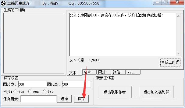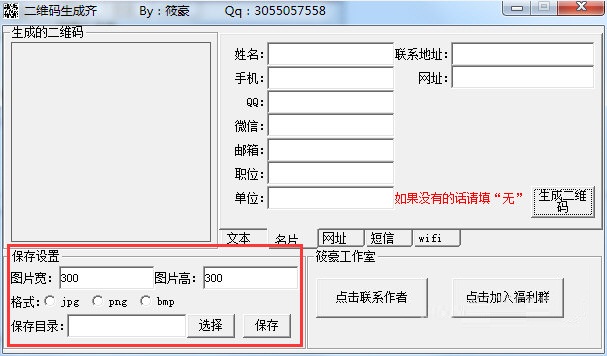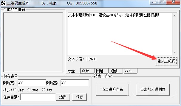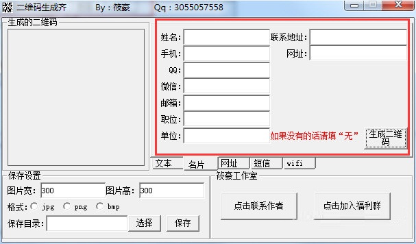筱豪二维码生成器是一款二维码生成软件,支持生成文本、网址、短信、WiFi、名片等多种形式的二维码,而且宽和高可随意调节,最后可以生成jpg、png或者bmp格式的图片,生成后就可以使用了。