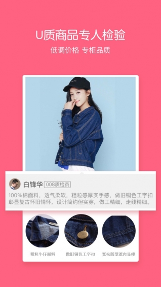 U质团所有的商品,都经过商家寄样、蘑菇街时尚买手挑款、大货入仓、样衣对比质检、统一包装、闪电发货的流程。在蘑菇街U质团里,用户们还能看到名叫“隐峰”的“新网红”,这位身穿白大褂的男生不是来卖衣服的,而是来质检的。“008号质检员”隐峰,也成了U质团里的常客,从袖口到衣领,线头、纽扣无一遗漏,统统放到手机镜头下拆包检查,把整个质检流程展现在消费者面前。