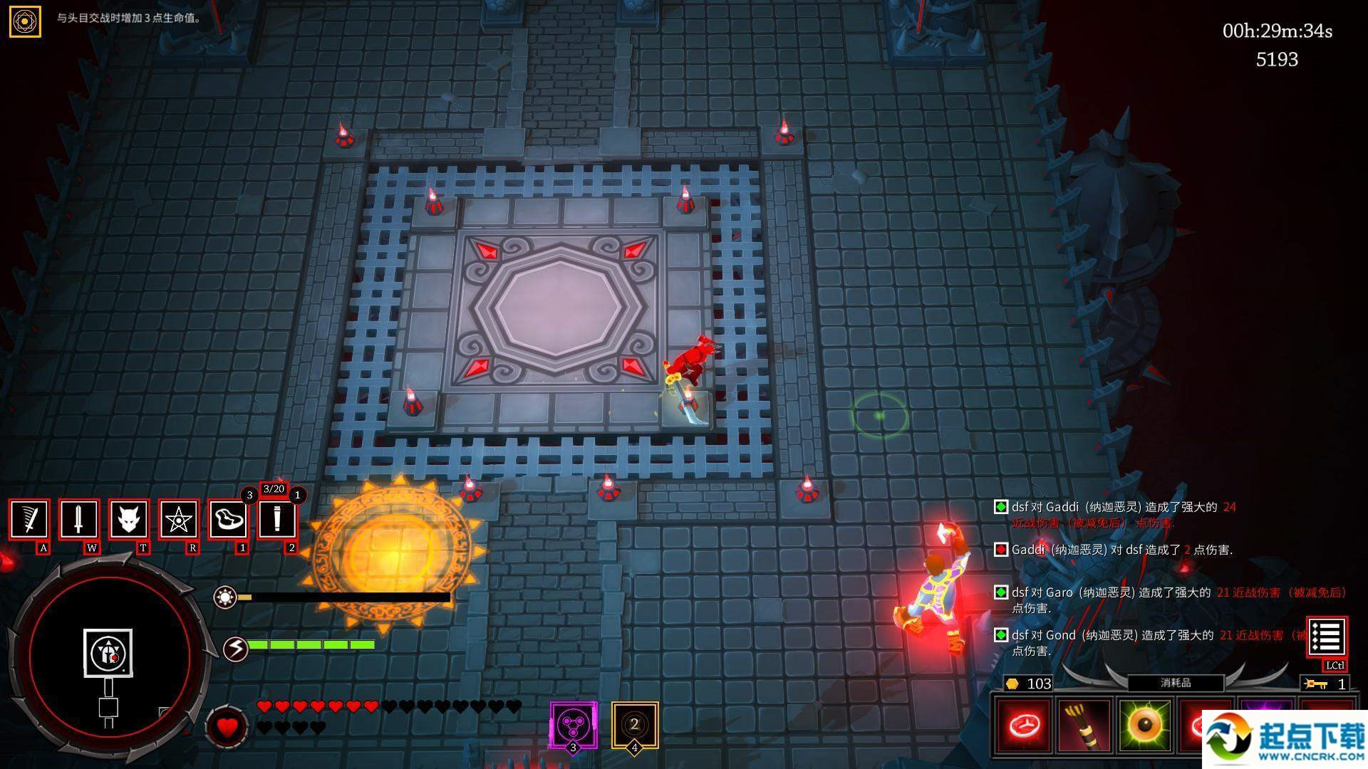要点注意:boss召唤的小兵这次移速非常快,也很脆,被击中以后会损失耐力值,这是非常致命的,意味着你将丧失行动力,所以千万别被近身。这次的boss非常惧怕近战攻击,在其技能真空期近身造成伤害(期间笔者爆出了一把非常好的近战武器,砍一刀30血,非常爽)第五关